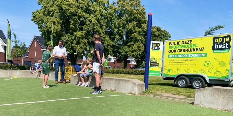 Je krijgt bovendien de Sportmobiel te leen, gevuld met sport- en spelmateriaal. Het springkussen maakt het feest compleet.